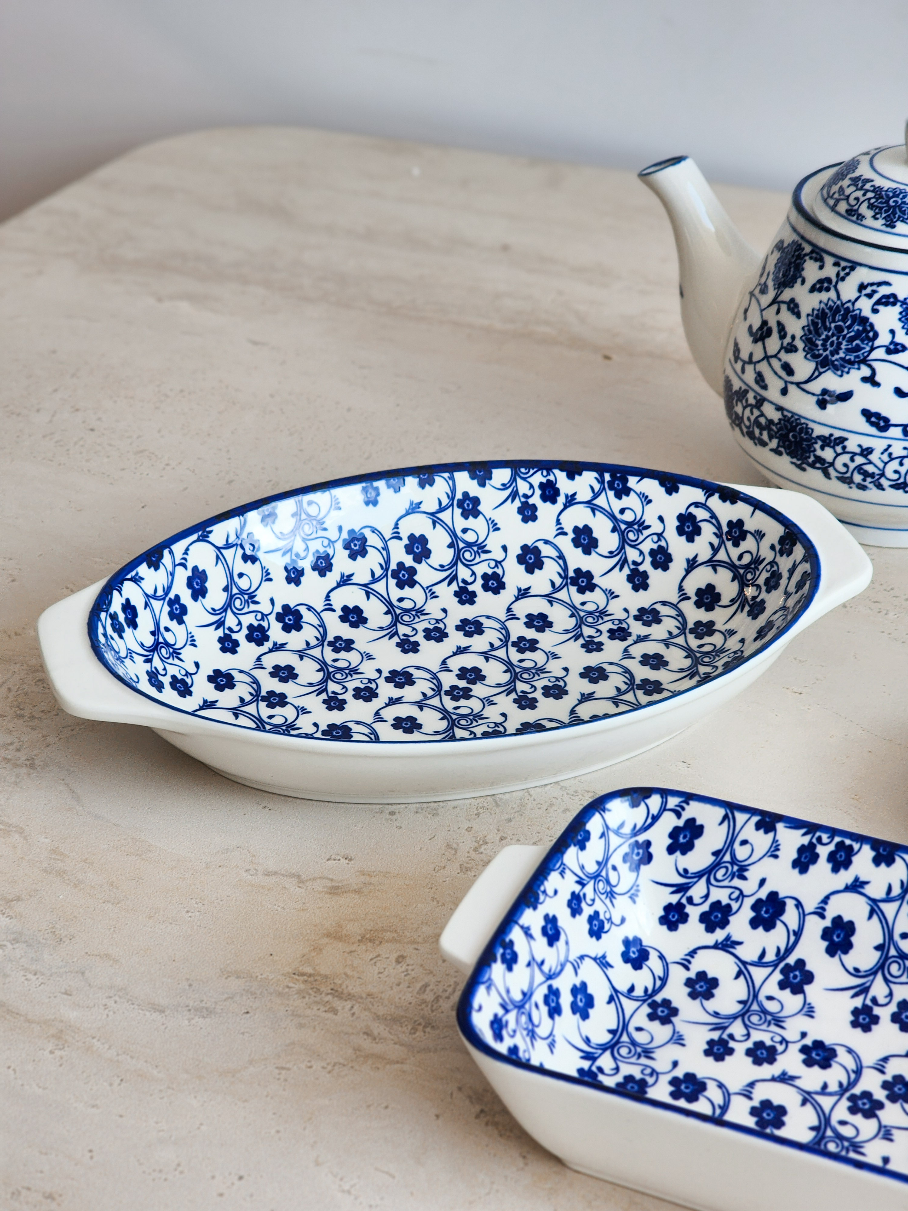 صحن بيضاوي مزخرف ابيض وازرق