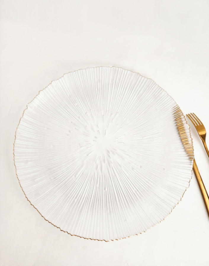 صحن مائدة كبير زجاجي شفاف باطراف ذهبية قطر ٣٣سم