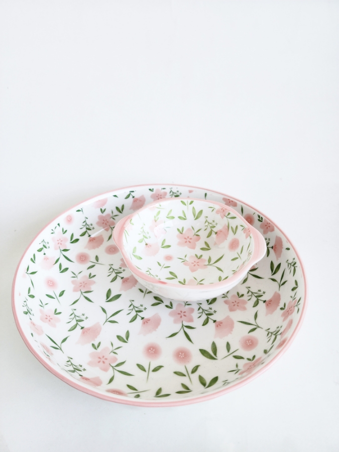 صحن مدور صغير بنقشة ورد باللون الزهري