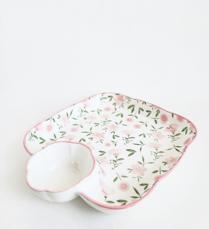 صحن مربع مع تجويف للصوص بنقشة ورد باللون الزهري