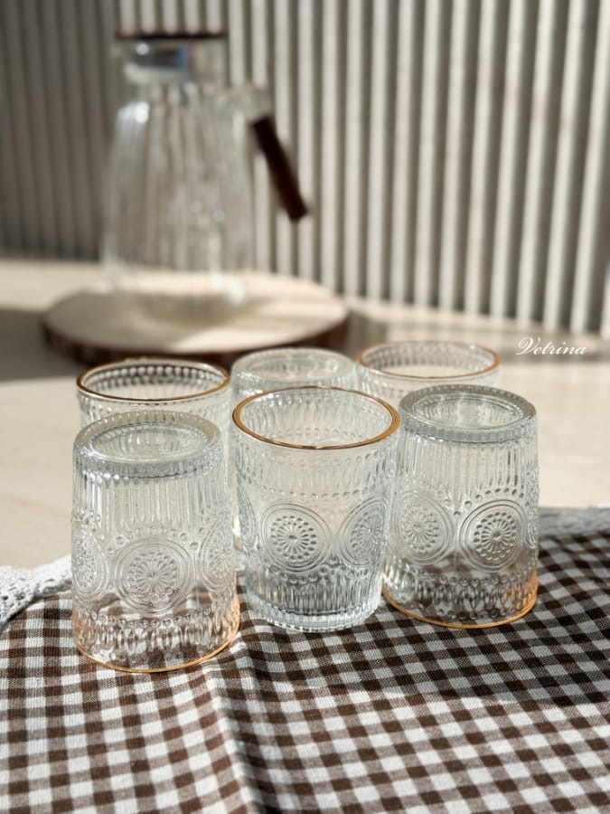 طقم كاسات عصير شفاف منقش حواف ذهبي 6 قطع