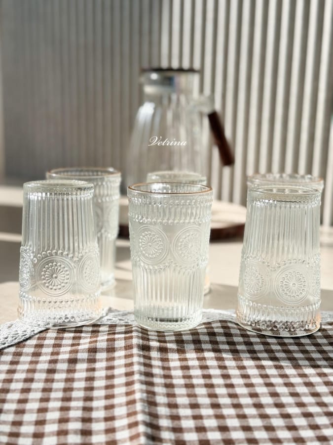 طقم كاسات عصير شفاف منقش حواف ذهبي 6 قطع