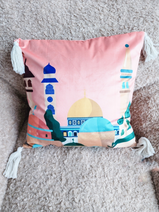 وجه مخدة رمضاني باللون الزهري رسمة القدس 45×45