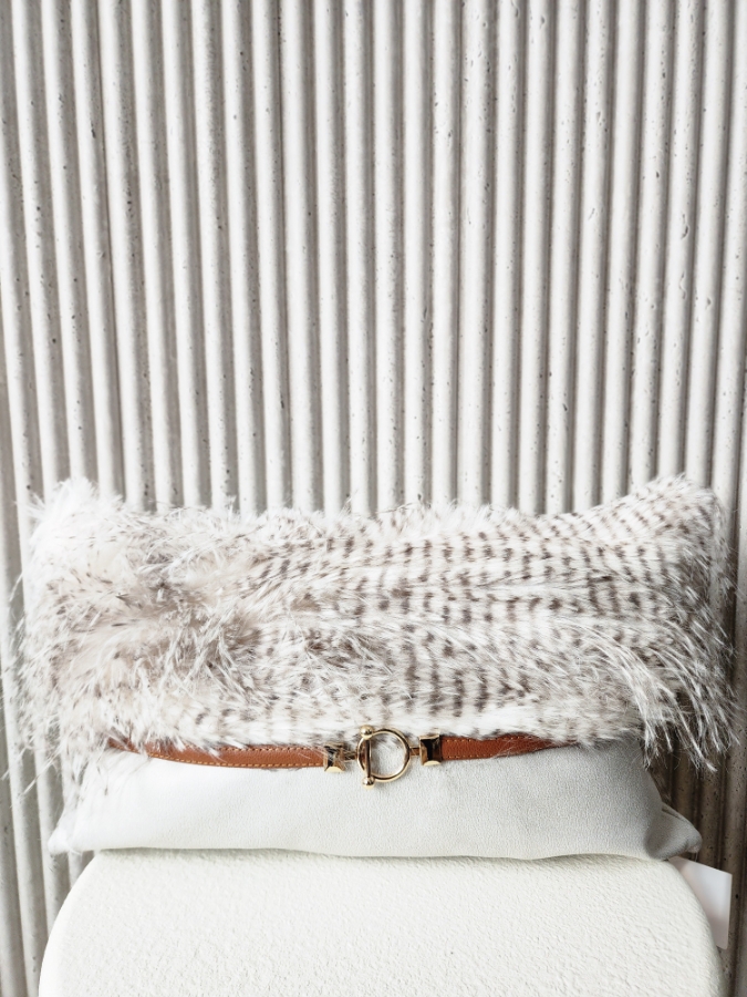 وجه مخدة مستطيلة فرو وجلد باللون الايفوري مع حزام جلد