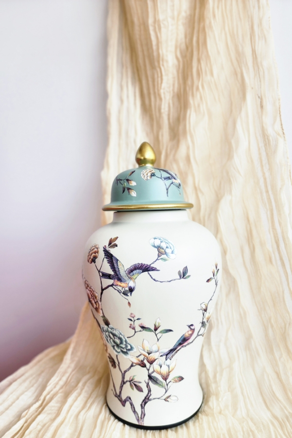 فازة زجاجية برسومات عصافير باللون البيج و التركواز الحجم الكبير