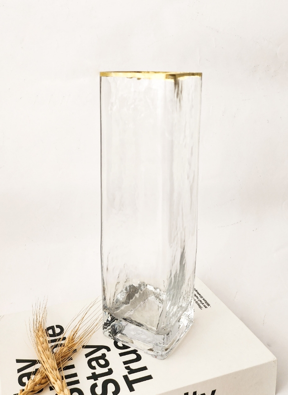 فازة زجاجية طويلة شفافة ايطار دهبي