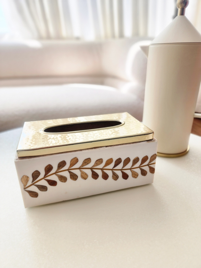علبة محارم خشبية باللون الابيض مع غطاء ذهبي