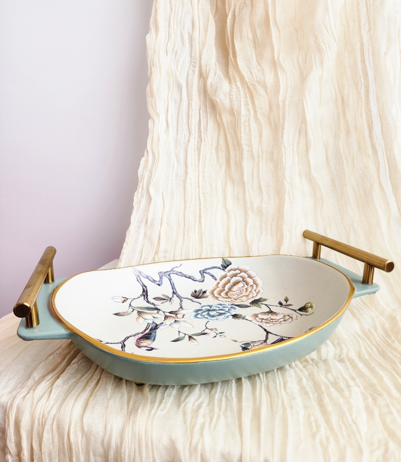 صحن ديكور زجاجي برسومات الورود و العصافير باللون التركوازي و البيج