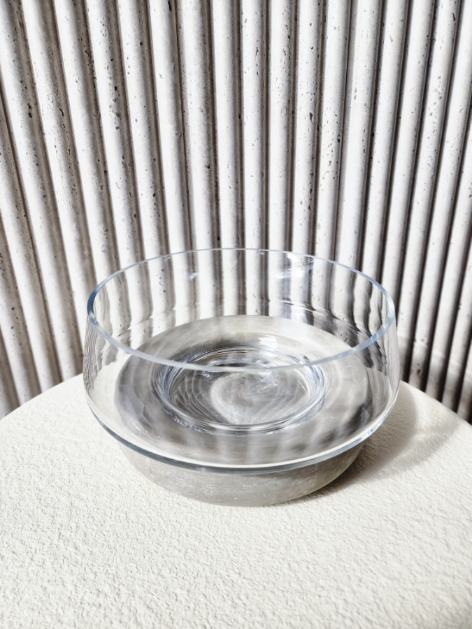 صحن ديكور زجاجي شفاف مع قاعدة باللون الفضي