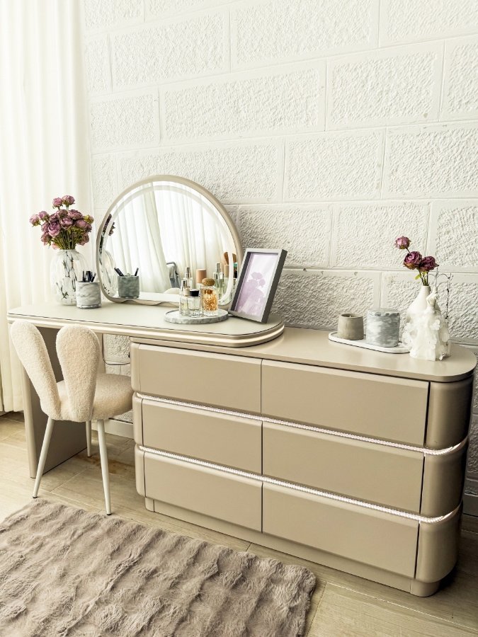 تسريحة غرفة نوم باللون البيج مع اضاءة وكرسي