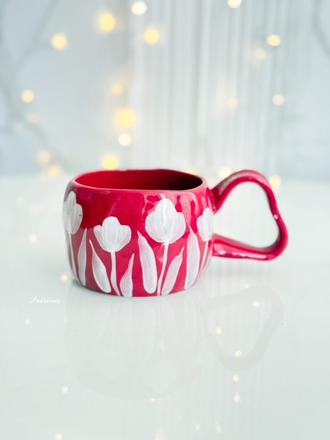 كوب لون احمر رسمة ورود لون ابيض
