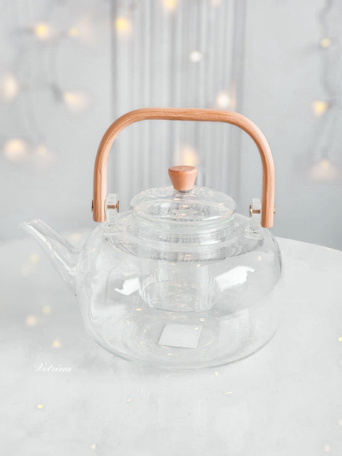 ابريق شاي زجاج شفاف مع مصفاي ايد خشب