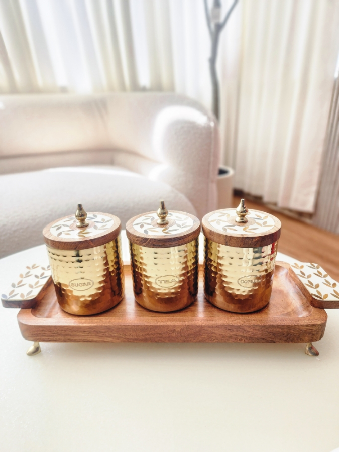 طقم سكريات خشبي منقش مع ذهبي 3 قطع