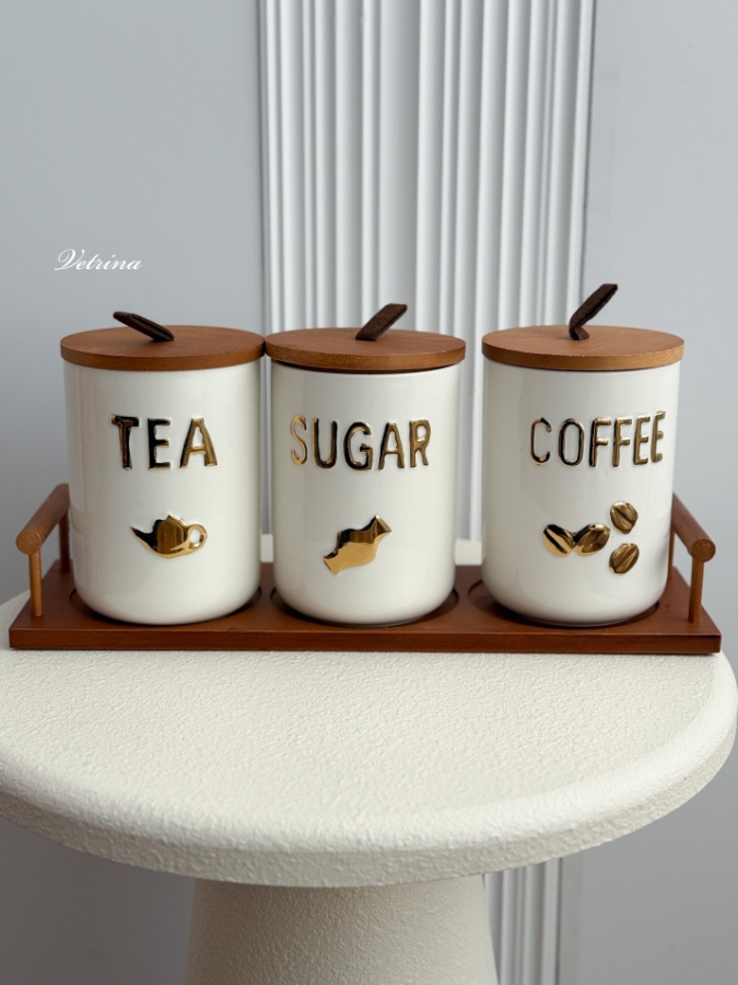 طقم 3 قطع سكر ، شاي ، قهوة زجاج غطاء خشب مع صينية خشب