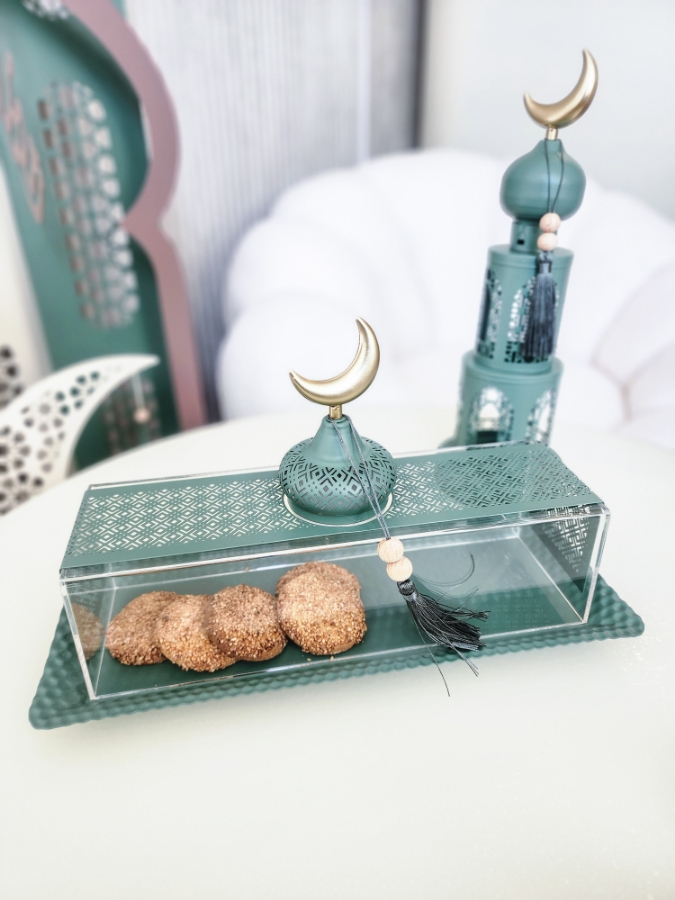 مضيفة رمضانية مستطيلة مع غطاء شفاف باللون الاخضر