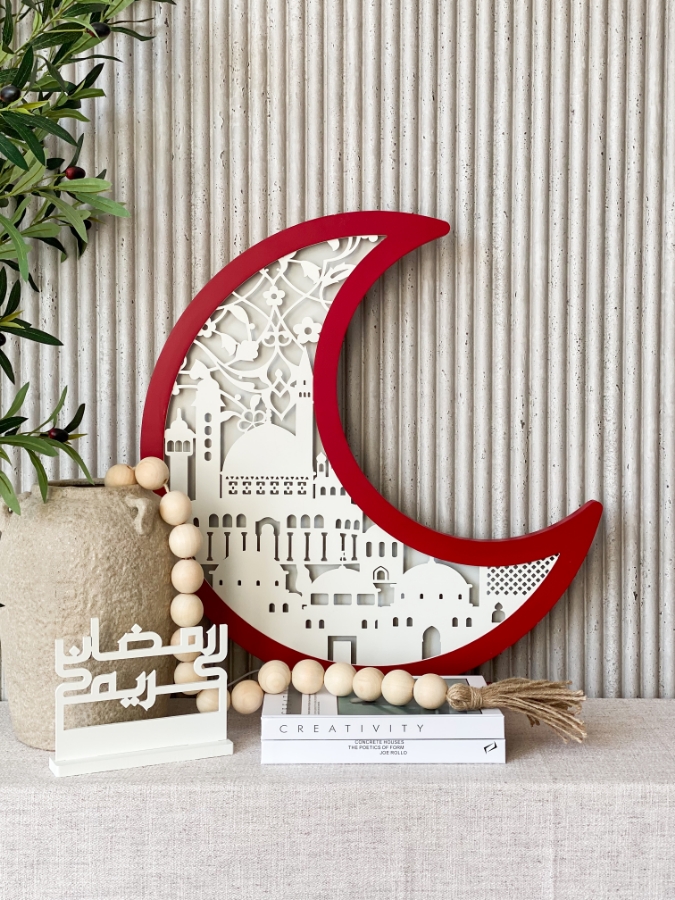 هلال المدينة خشب باللون الاحمر والابيض مضيئ