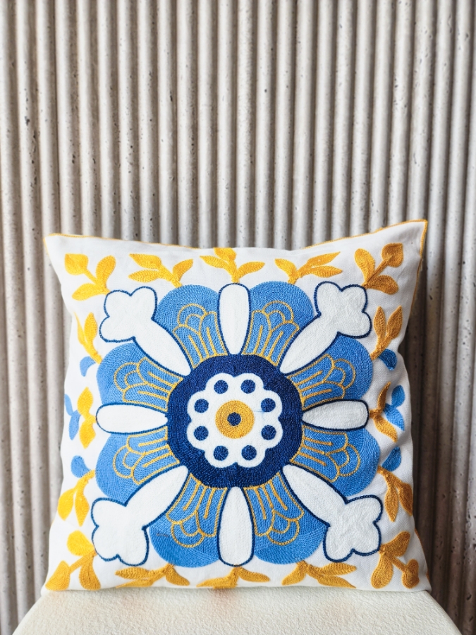 وجه مخدة مربع مطرز باللون الاصفر و الازرق45×45