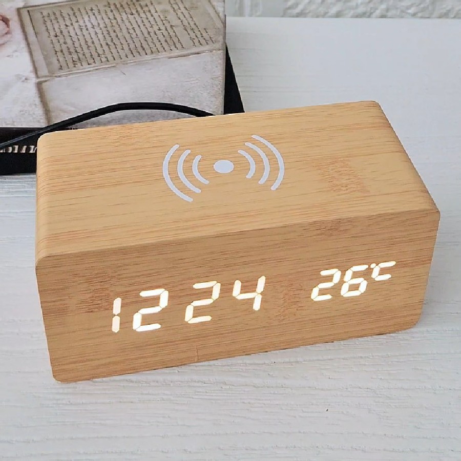 ساعة خشب مكتبية حجم 15*7cm بخاصية شحن للهاتف
