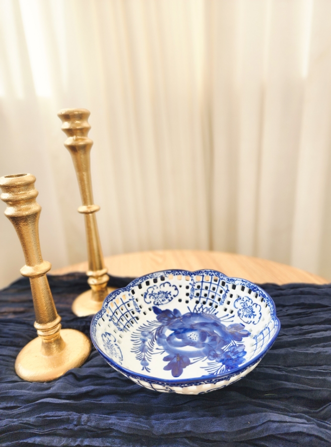صحن زجاج مع زخرفة باللون الازرق الحجم الصغير