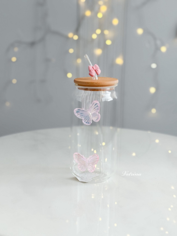 كاسة شفافة شكل فراشات غطاء خشب غطاء خشب
