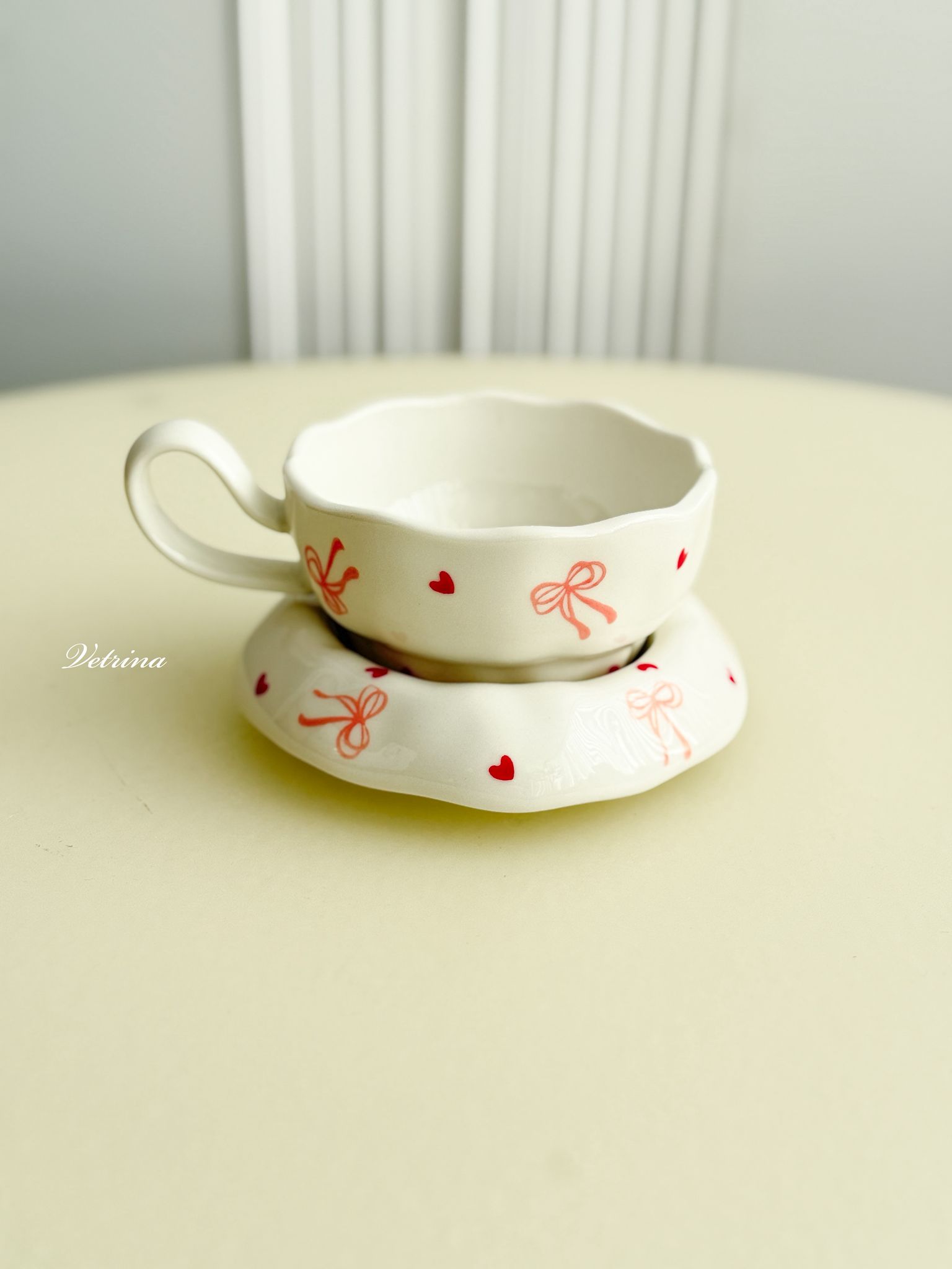 كوب مع صحن شكل قلب مع ببيونة