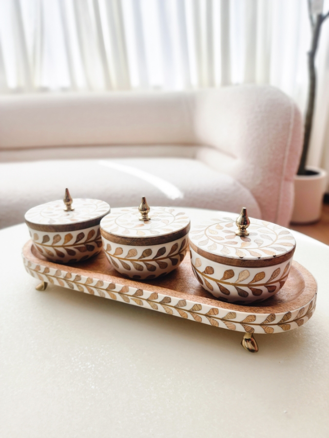 مضيفة خشبية ثلاثية منقشة بالابيض مع اغطية خشبية