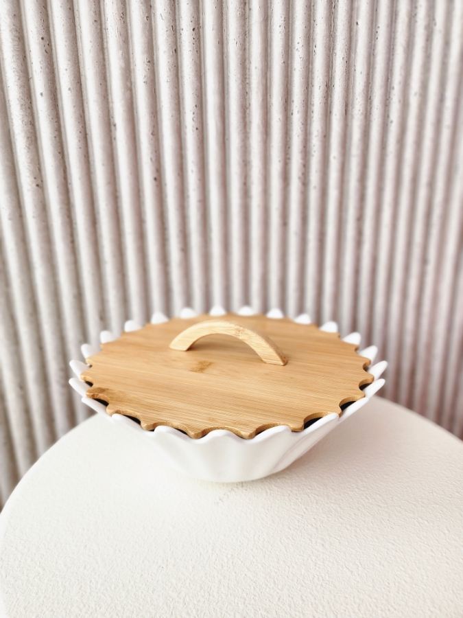 صحن تقديم زجاجي باللون الابيض مع غطاء خشبي