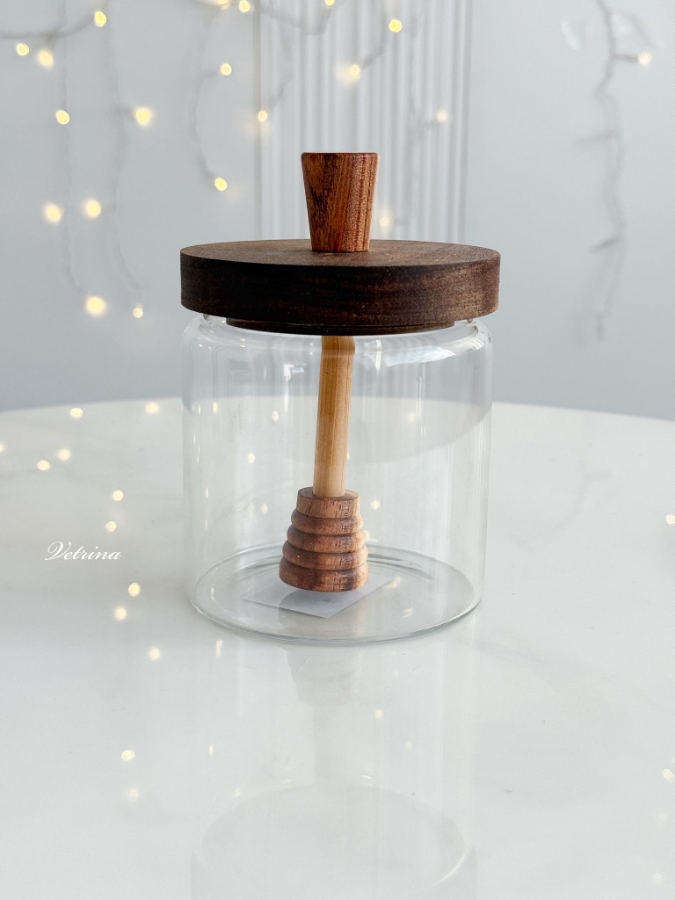 مرطبان شفاف غطاء خشب مع مسكة للعسل